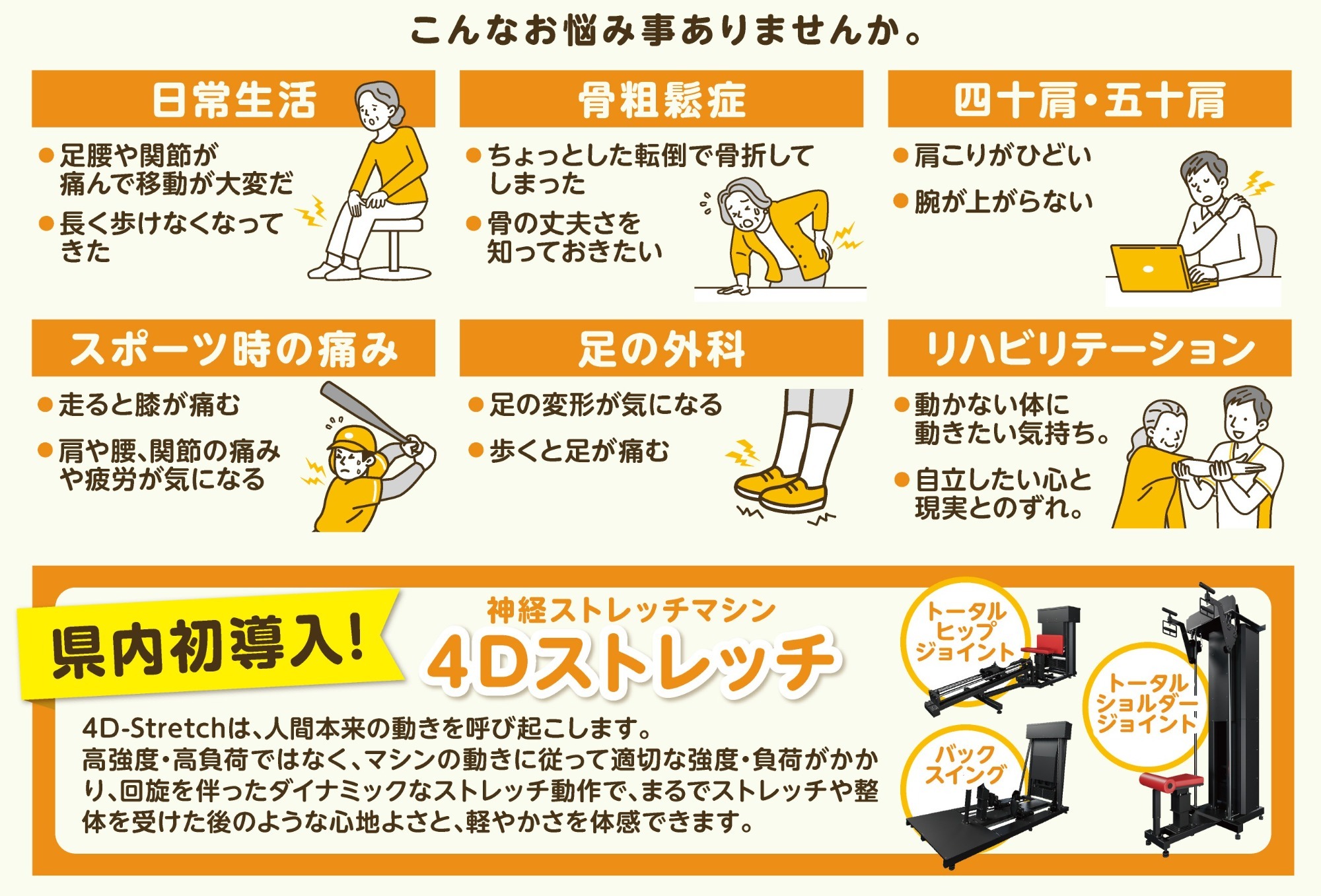 高齢化社会に対応し、骨粗しょう症予防やロコモティブ症候群対策など、高齢者特有のニーズに応えられます。
